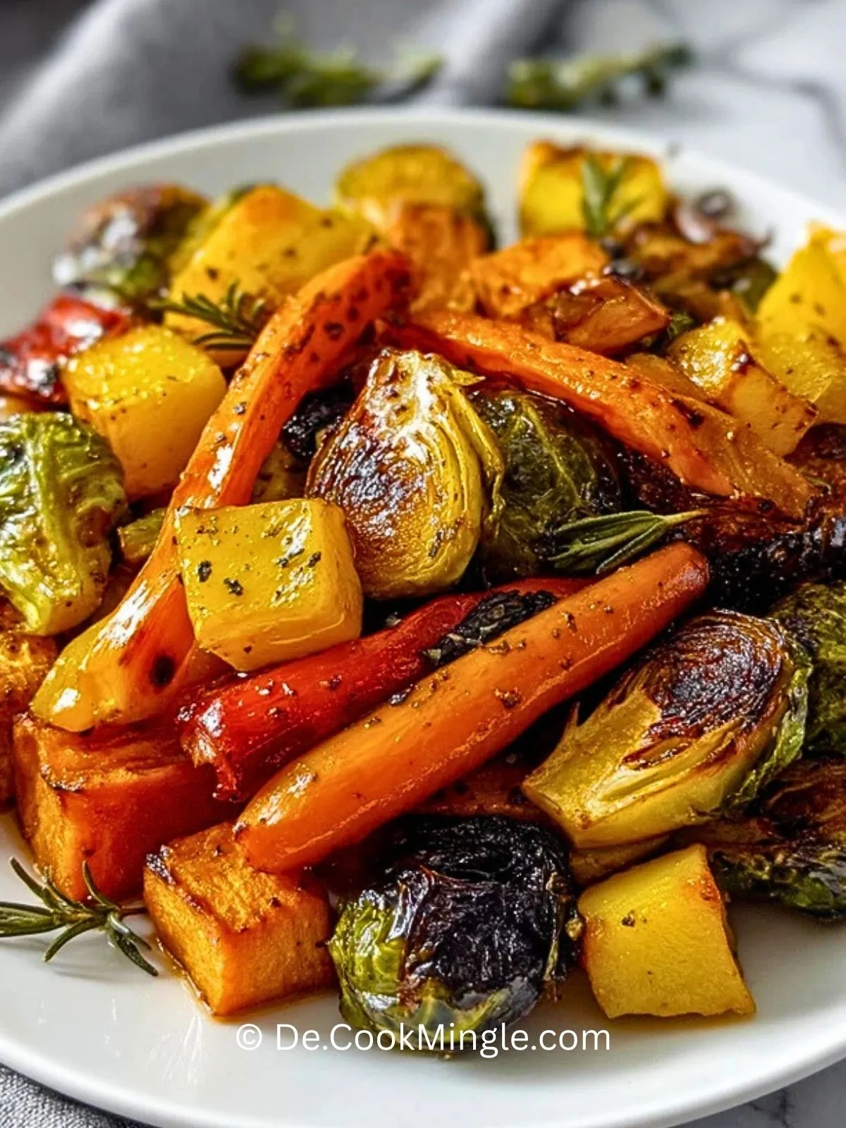 Aromatisches Ahorn-Röstgemüse für Thanksgiving: buntes Ofengemüse aus Karotten, Kürbis, Pastinaken, Rosenkohl und Roter Bete, das in einer würzig-süßen Ahornsirup-Marinade karamellisiert und perfekt als festliche Beilage zu Truthahn, Braten oder einer vegetarischen Hauptspeise passt.