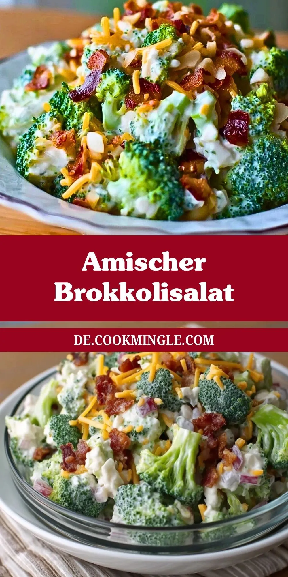 Der klassische amische Brokkolisalat lebt vom Kontrast: roher, knackiger Brokkoli trifft auf ein mild-süßes Dressing aus Mayonnaise, Joghurt, Zucker und Essig. Dazu kommen herzhafter, knuspriger Speck, würziger Käse und kleine Extras wie rote Zwiebel und Sonnenblumenkerne für Biss. Diese Kombination aus süß, salzig, cremig und knackig macht ihn so unverwechselbar – und genau darum verschwindet die Schüssel meistens als erstes vom Tisch.