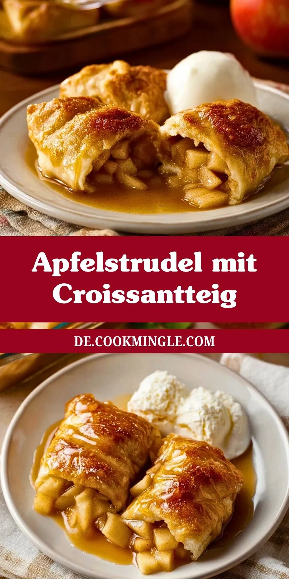 Schneller Apfelstrudel mit Croissantteig: Fruchtige Äpfel, gewürzt mit Zimt und Vanille, werden in buttrigen Croissantteig eingewickelt und in einer köstlichen karamellisierten Sauce gebacken. Das perfekte Dessert für alle, die klassische Aromen lieben, aber wenig Zeit haben!