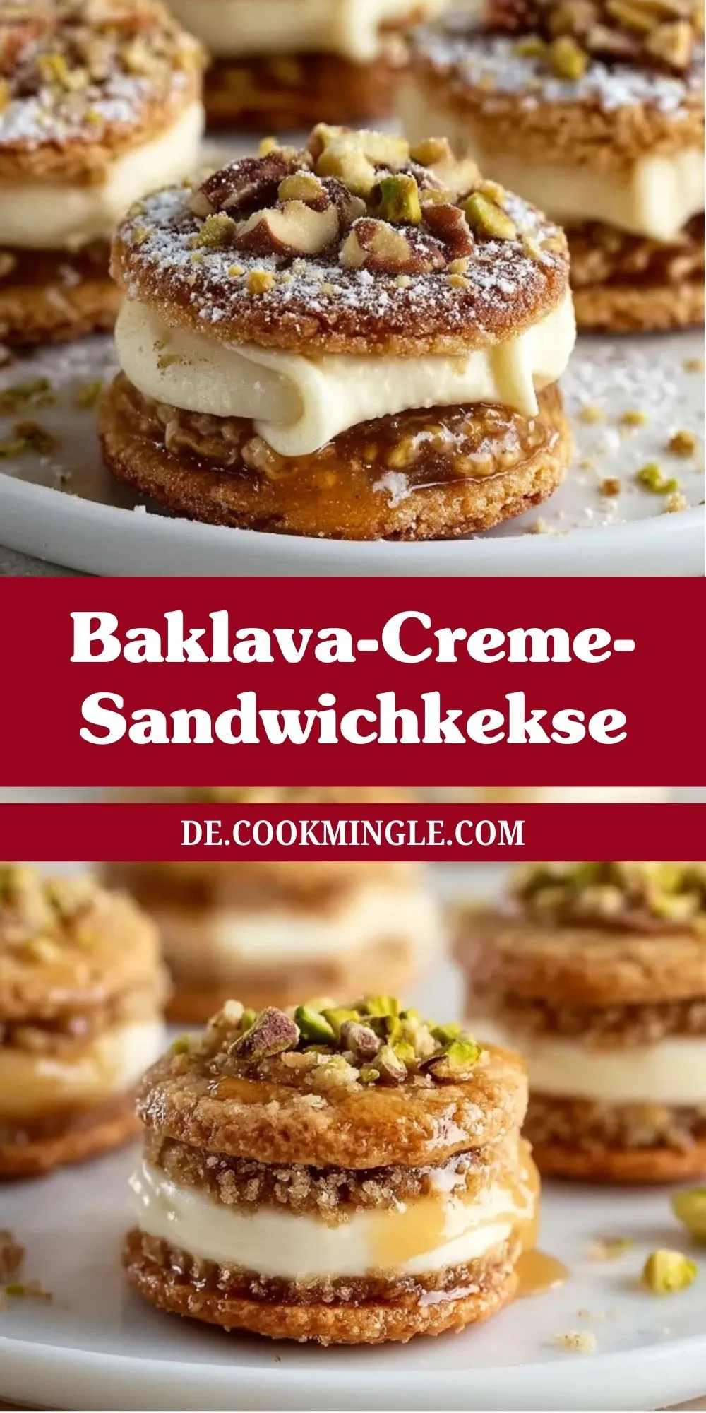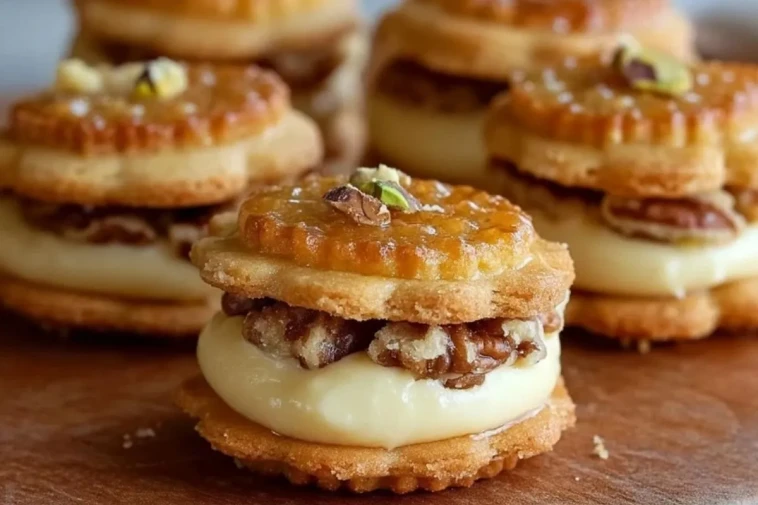 Diese Baklava-Creme-Sandwichkekse vereinen knusprigen Butterkeks, eine cremige Vanillefüllung und karamellisierte Nüsse – inspiriert vom klassischen Baklava. Perfekt für Festtage, Geschenke oder einfach für Genießer!
