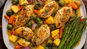 Blattpfannen-Honig-Dijon-Hühnchen mit Gemüse