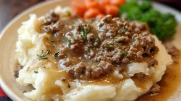 Hackfleisch mit Bratensoße auf Kartoffelpüree