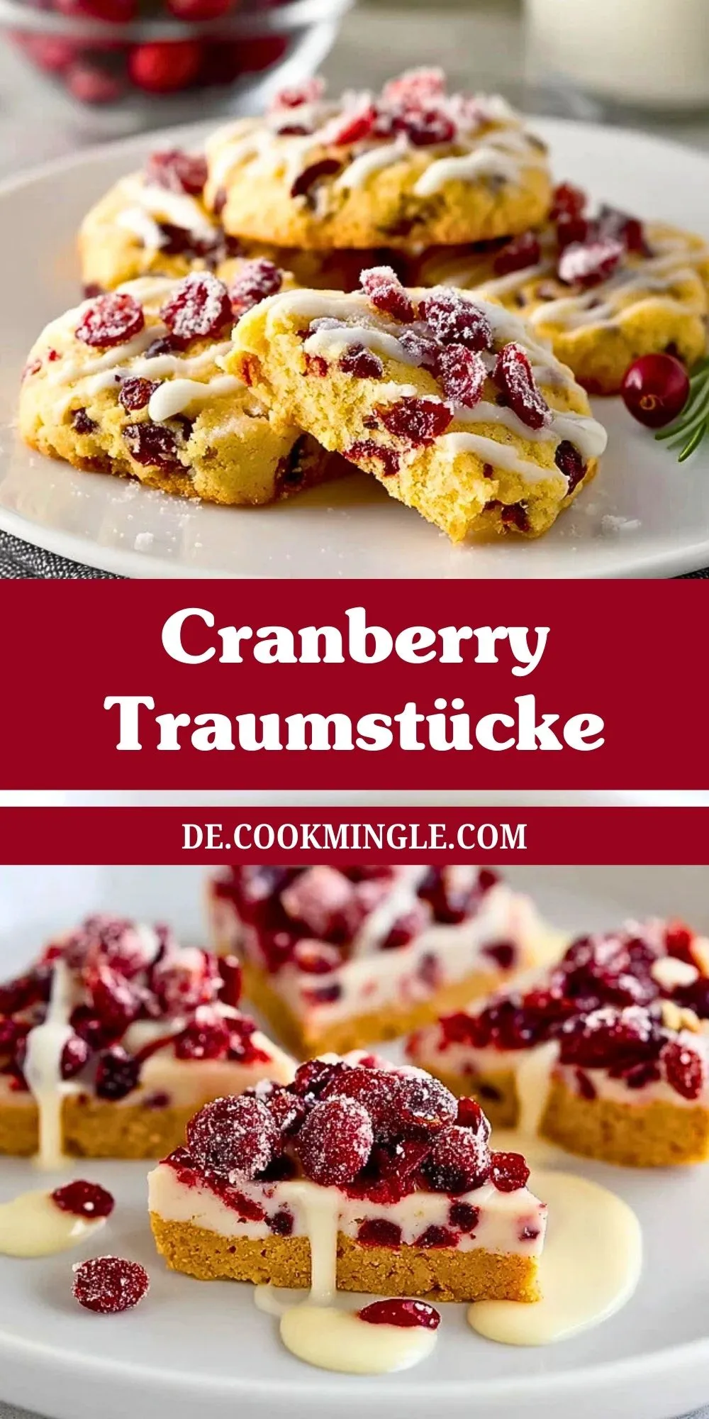 Saftige, leuchtend rote Cranberry Traumstücke mit fluffigem Teig, fruchtigen Cranberries und einem cremigen Guss – das perfekte Gebäck für Wintertage, Advent oder festliche Anlässe!
