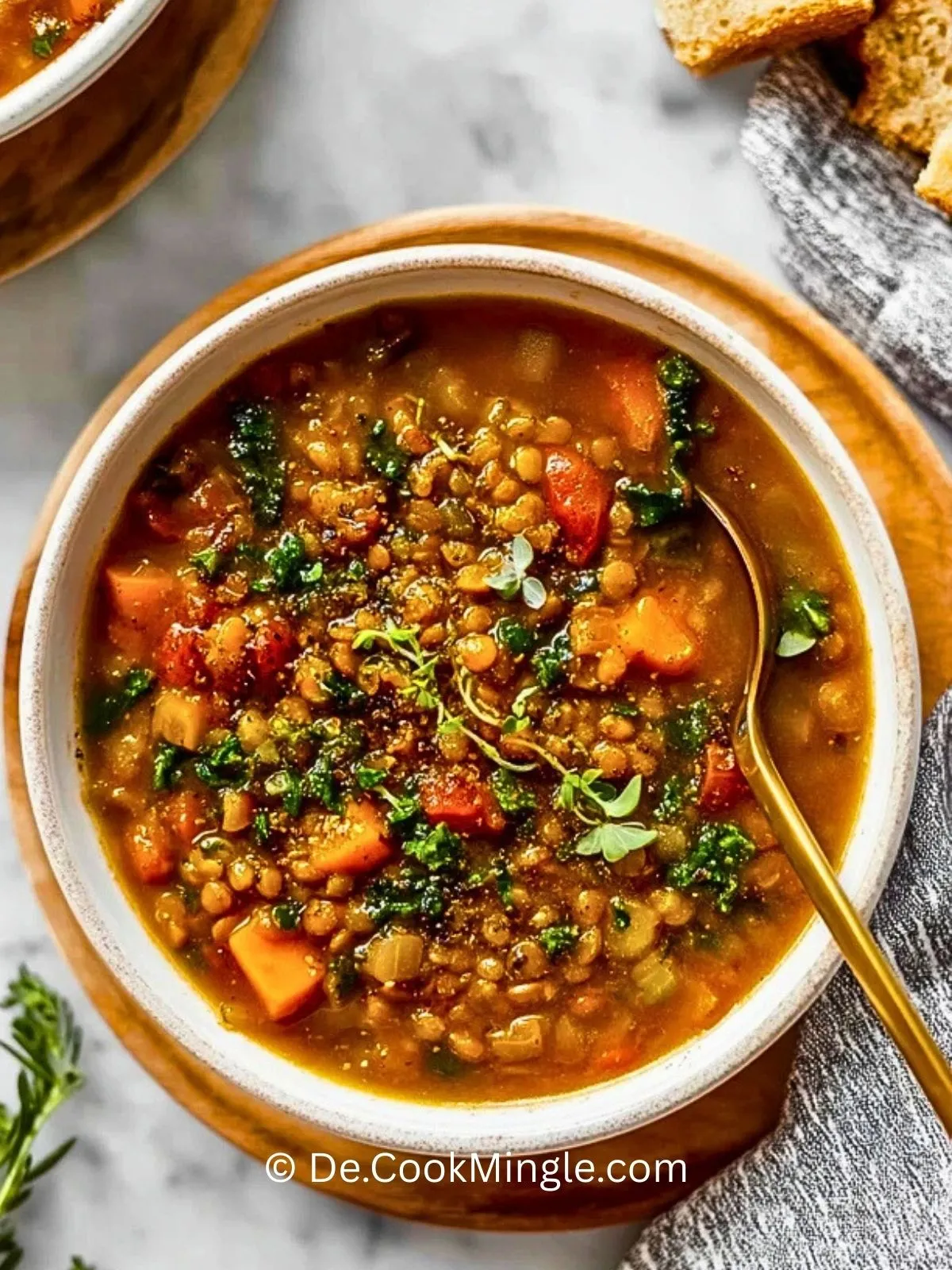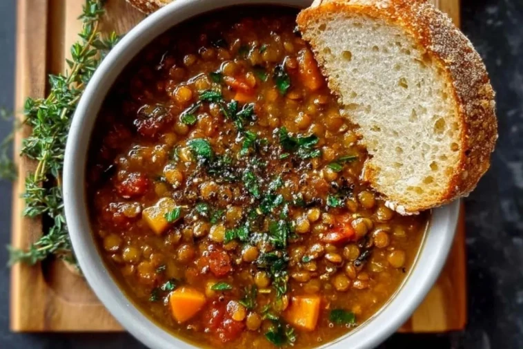 8. Linsensuppe in Schalen füllen, nach Wunsch mit zusätzlicher Petersilie bestreuen und mit knusprigem Brot servieren.