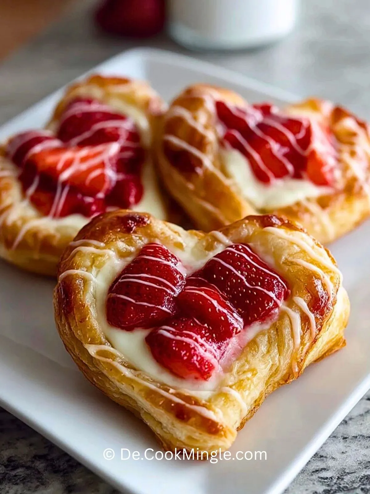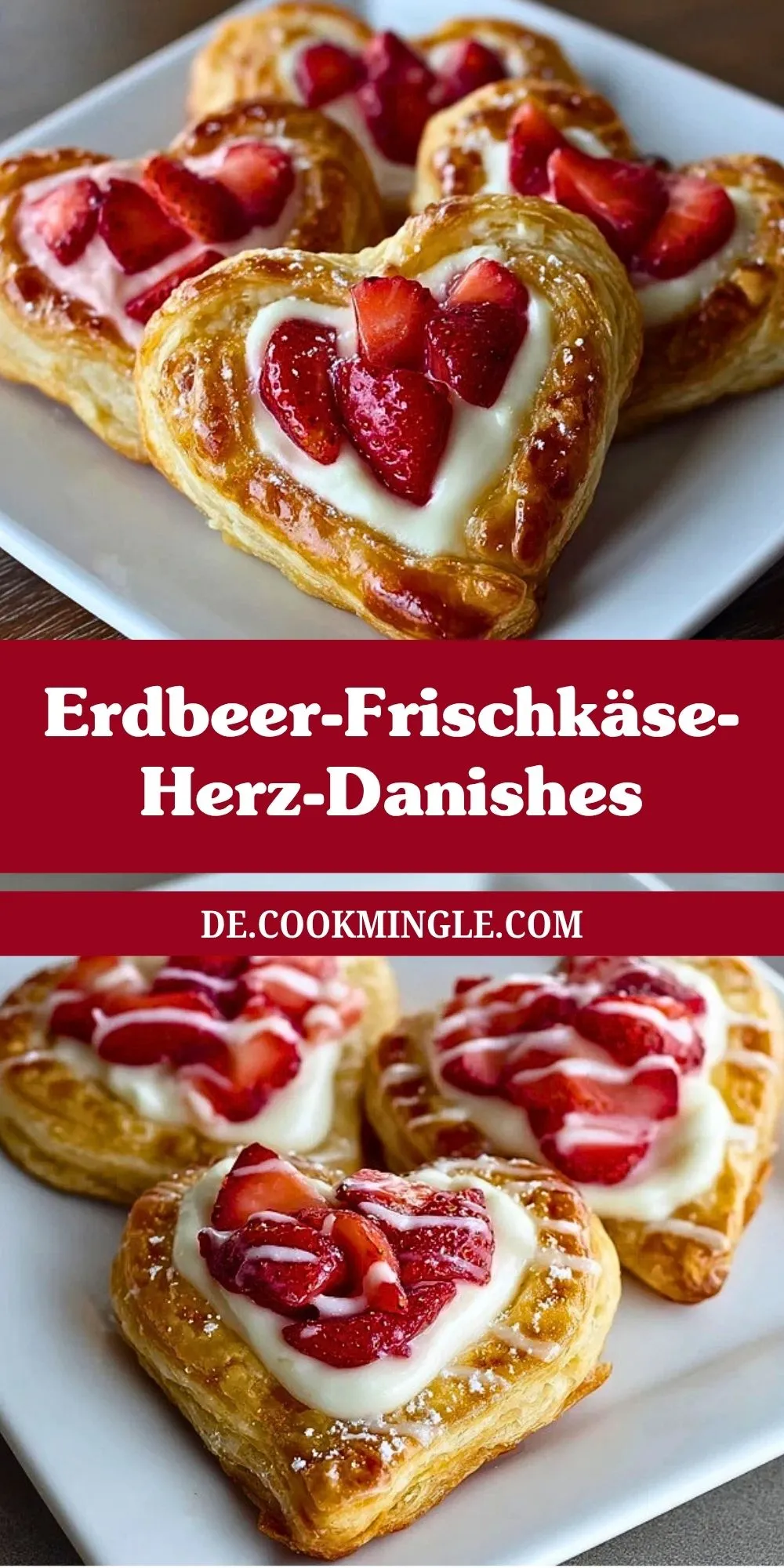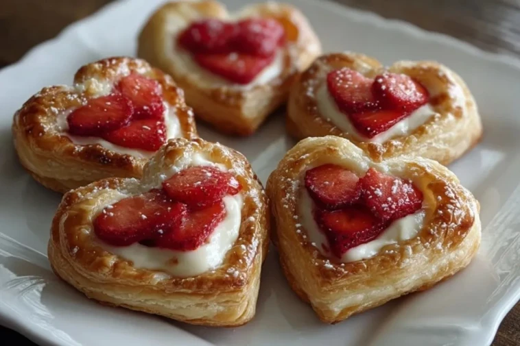 Knusprige Erdbeer-Frischkäse-Herz-Danishes aus goldbraunem Blätterteig mit cremiger Vanille-Frischkäsefüllung und frischen Erdbeeren sind ein einfaches, romantisches Gebäck für Brunch, Kaffeetafel oder besondere Anlässe. Sie gelingen mit wenigen Zutaten, sehen wunderschön aus und schmecken am besten leicht warm mit einer feinen Schicht Puderzucker.