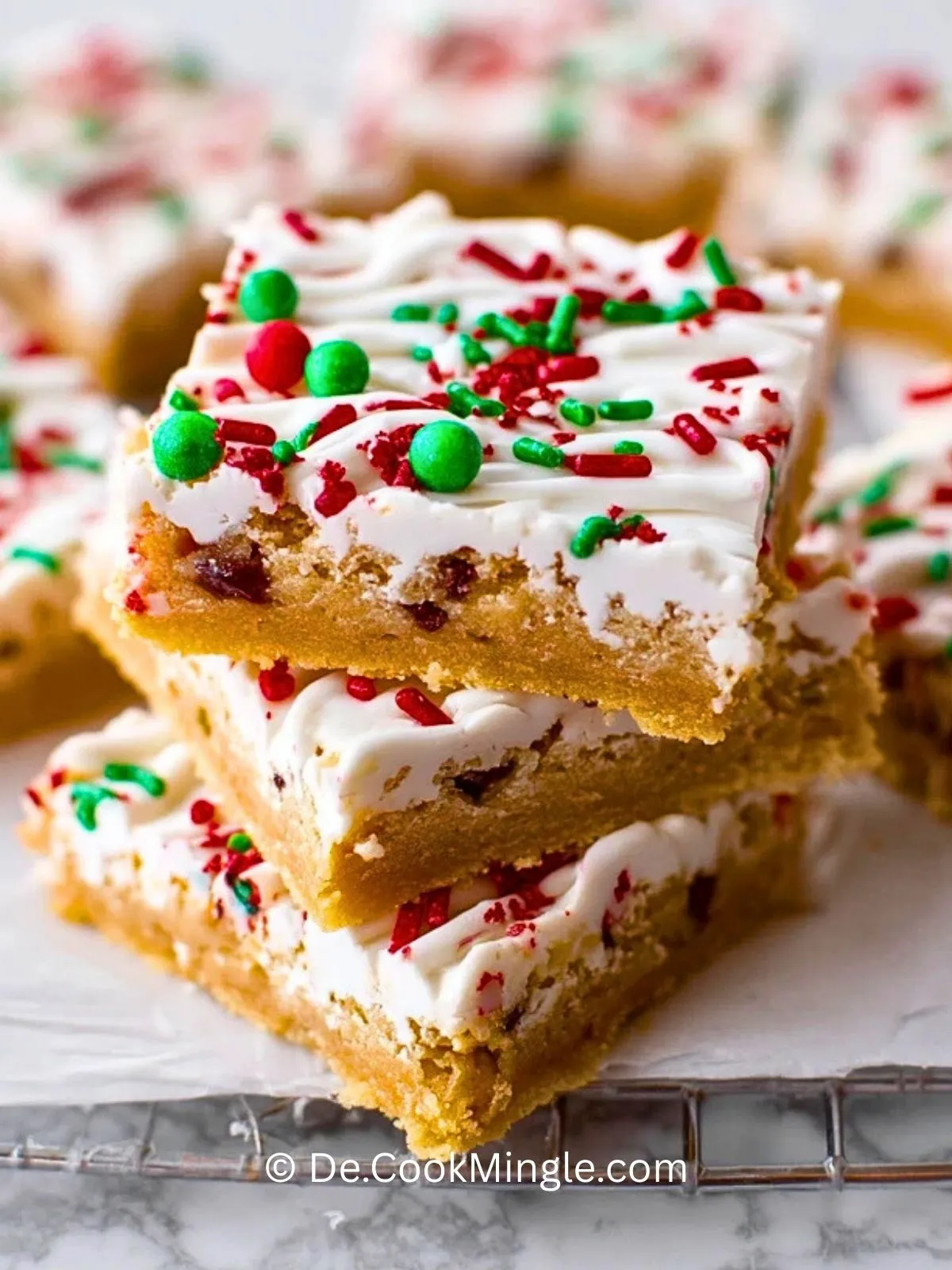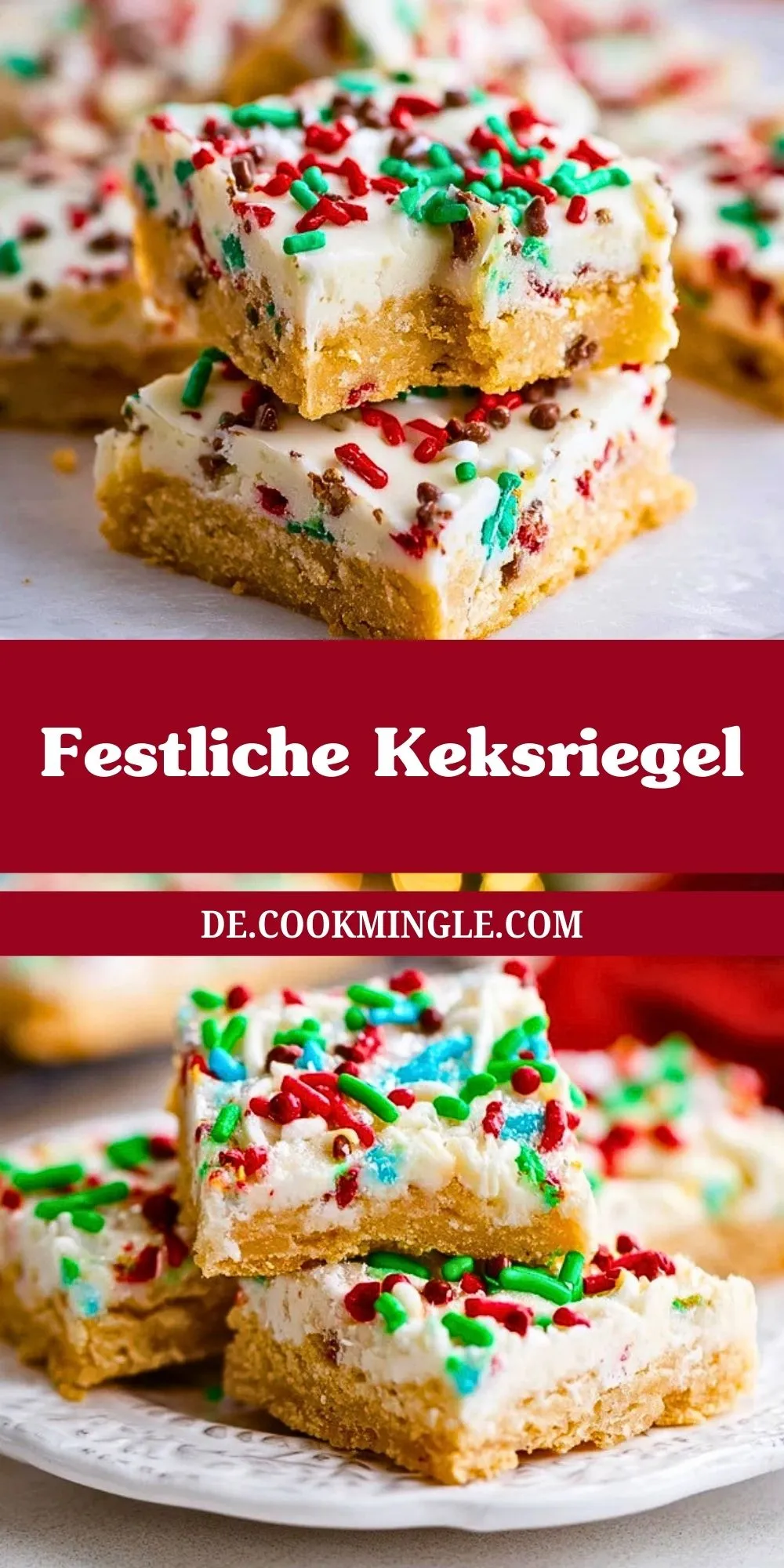 Festliche Keksriegel sind genau das Richtige, wenn du zur Weihnachtszeit etwas Süßes backen möchtest, das unkompliziert gelingt und trotzdem sofort Eindruck macht. Der weiche, buttrige Boden, die helle Glasur und die rot-grünen Streusel sorgen zusammen für einen klassischen, winterlichen Look, der auf jeder Keksplatte und jedem Adventsbuffet wunderbar zur Geltung kommt.