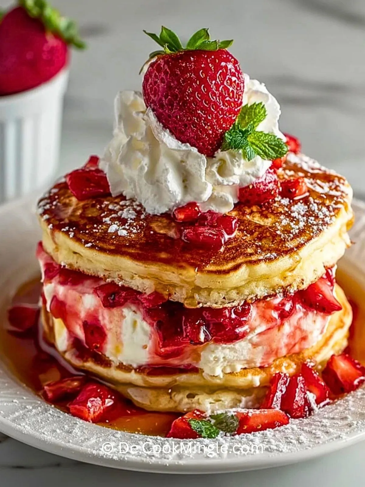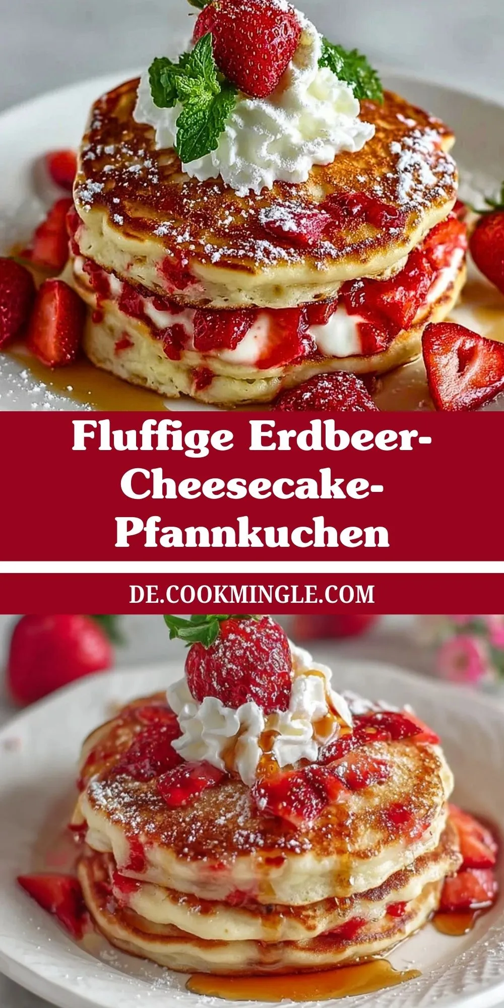 Stell dir vor, du startest deinen Tag mit einem Stapel unglaublich fluffiger Pfannkuchen, die mit einer cremigen Cheesecake-Schicht und frischen, saftigen Erdbeeren geschichtet sind. Ein Hauch von Puderzucker und ein Spritzer Ahornsirup machen dieses Frühstück nicht nur zum Genuss, sondern zu einem echten Highlight – egal ob für ein gemütliches Wochenendfrühstück oder als süßes Dessert.