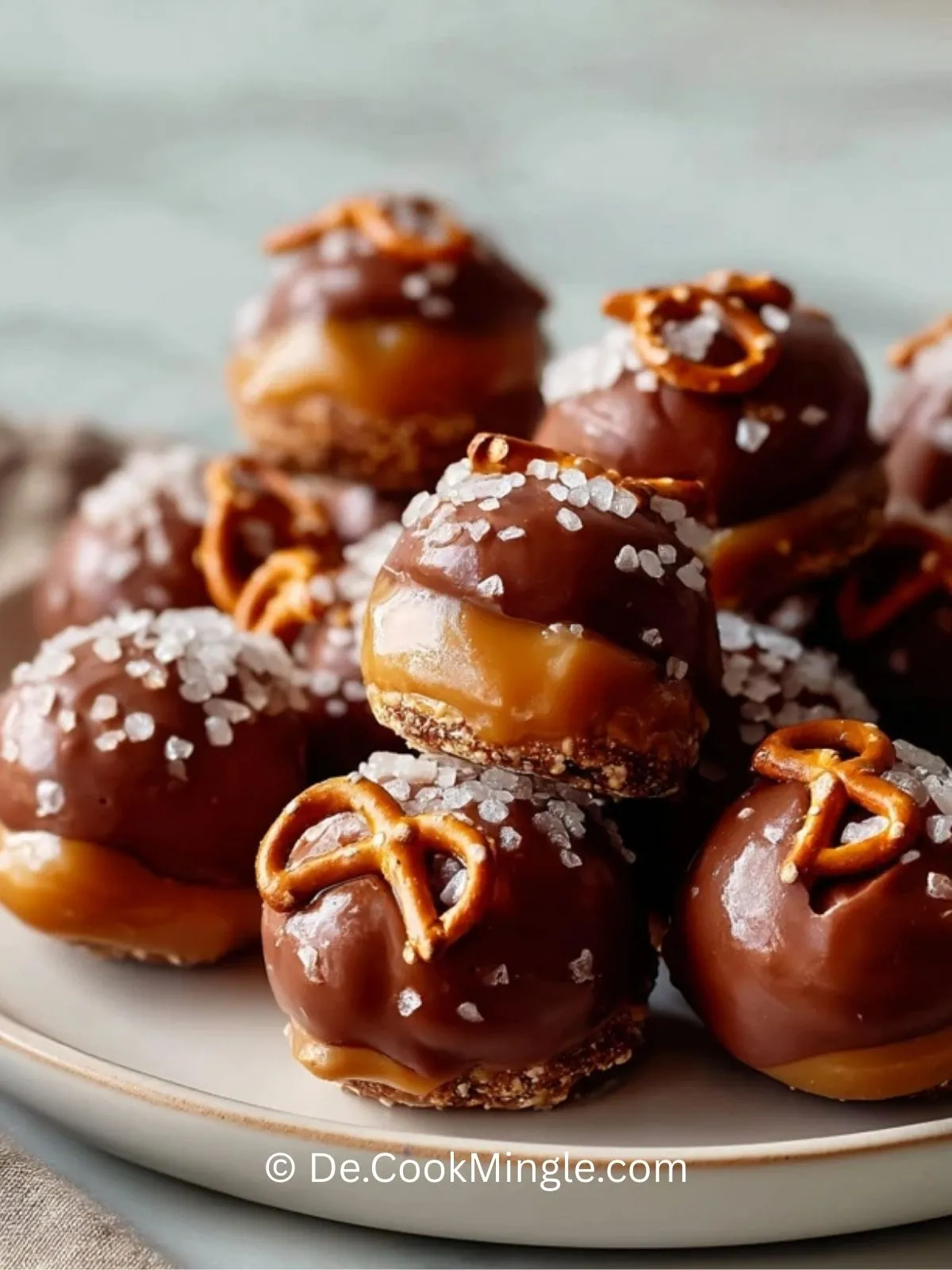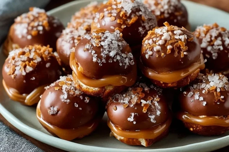 Gesalzene Karamell-Brezel-Bällchen sind kleine, süß-salzige Pralinenhappen mit knuspriger Brezelbasis, cremiger Karamellfüllung und einem Überzug aus geschmolzener Schokolade. Sie sind ideal für Feiertage, Dessertplatten, Geschenkboxen oder als unkomplizierter Genuss zum Kaffee.