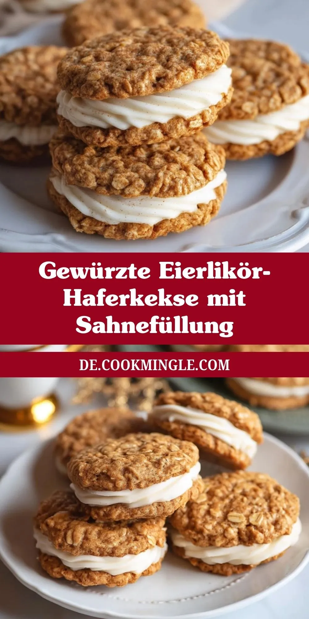 Knusprige, gewürzte Haferkekse, gefüllt mit einer luftig-leichten Sahne-Mascarpone-Creme und feinem Eierlikör. Diese festlichen Sandwich-Kekse sind das Highlight jeder Keksdose und bringen winterliche Aromen auf deinen Plätzchenteller. Perfekt für Advent, Weihnachten oder als süßes Geschenk!