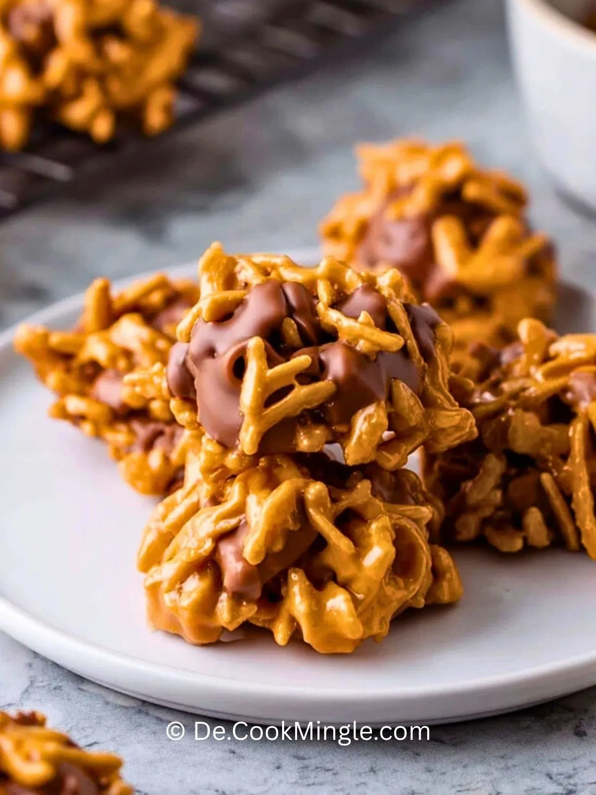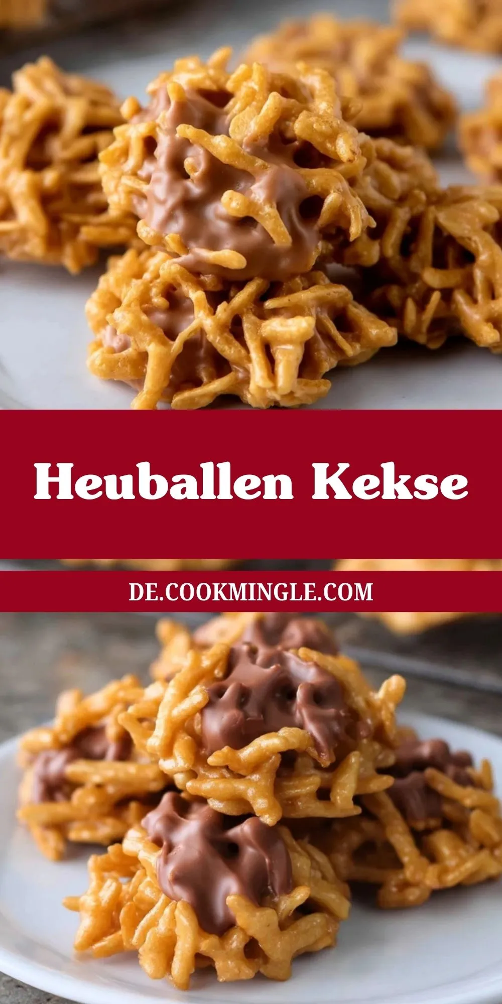 Knusprige Cornflakes, umhüllt von einer cremigen Schoko-Erdnussbutter-Masse – diese Heuballen Kekse werden ohne Backofen zubereitet und sind in wenigen Minuten bereit zum Knuspern.