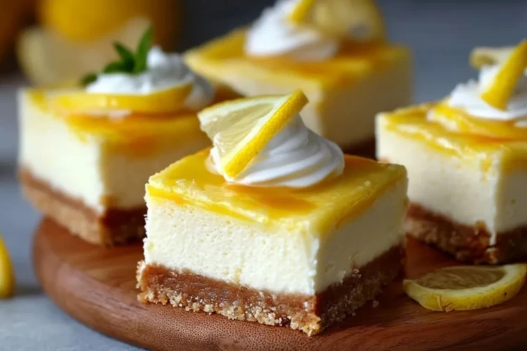 Diese himmlischen Zitronen-Cheesecake-Riegel verbinden eine samtige Frischkäsefüllung mit frischer Zitronennote und einem buttrigen Keksboden. Jeder Bissen schmeckt cremig, leicht und angenehm fruchtig – genau die richtige Balance zwischen süß und säuerlich.