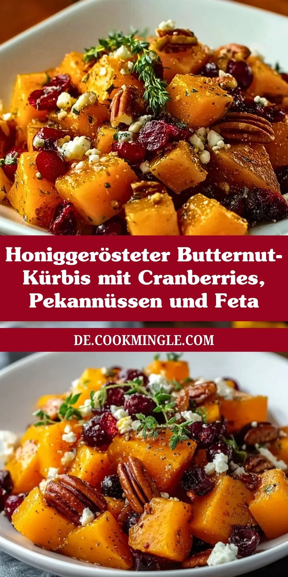 Herbst pur: Zarter, im Ofen karamellisierter Butternut-Kürbis, verfeinert mit Honig, Cranberries, knackigen Pekannüssen und cremigem Feta. Diese festliche Gemüsebeilage überzeugt durch Aroma, Textur und Farbe – als Highlight auf jeder Tafel oder als vegetarisches Hauptgericht. Schnell zubereitet, gut vorzubereiten und ein echter Blickfang!