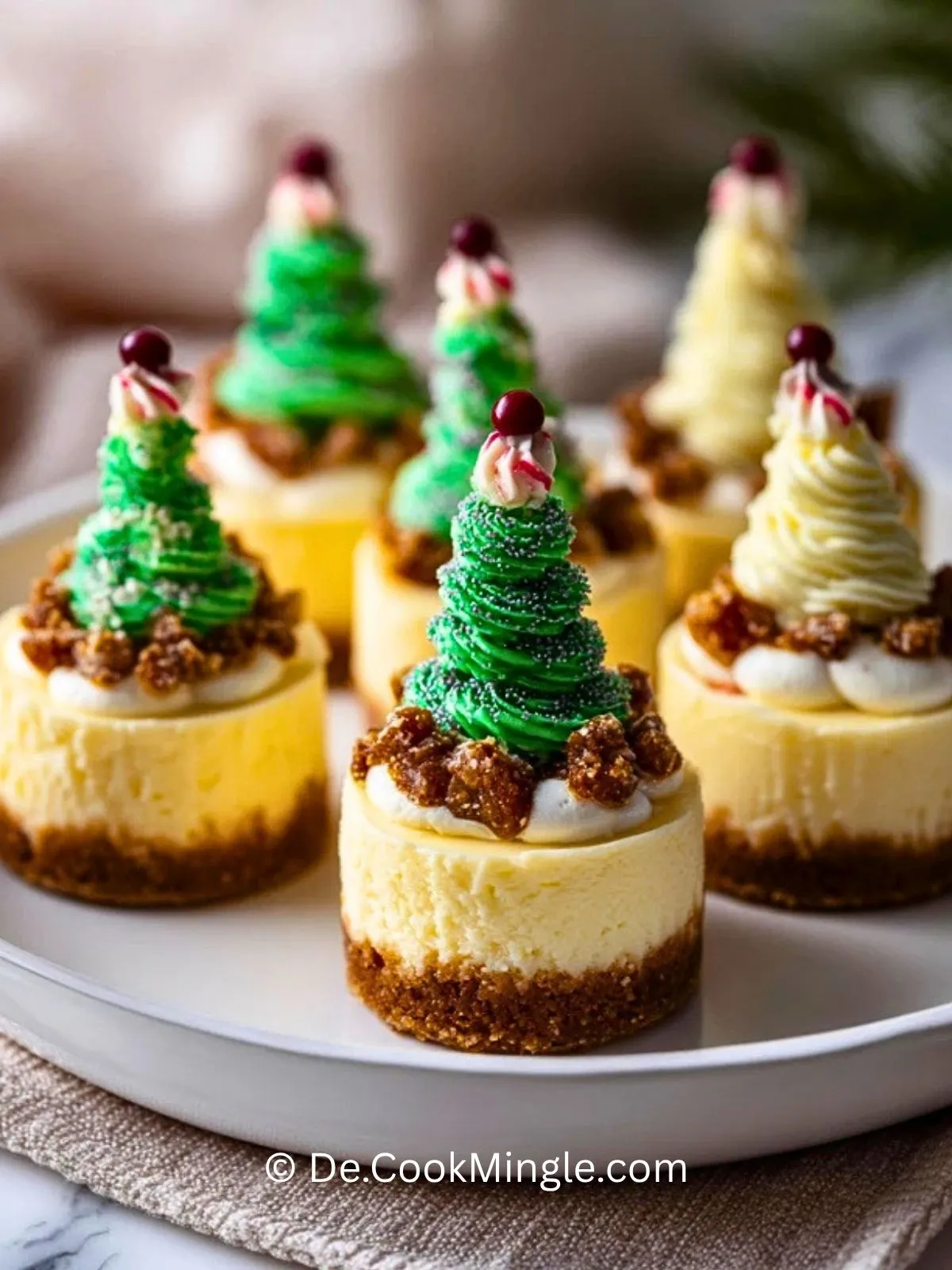 10. Je einen dekorierten Mini-Baum vorsichtig auf jeden Käsekuchen setzen und bis zum Servieren kühl lagern.