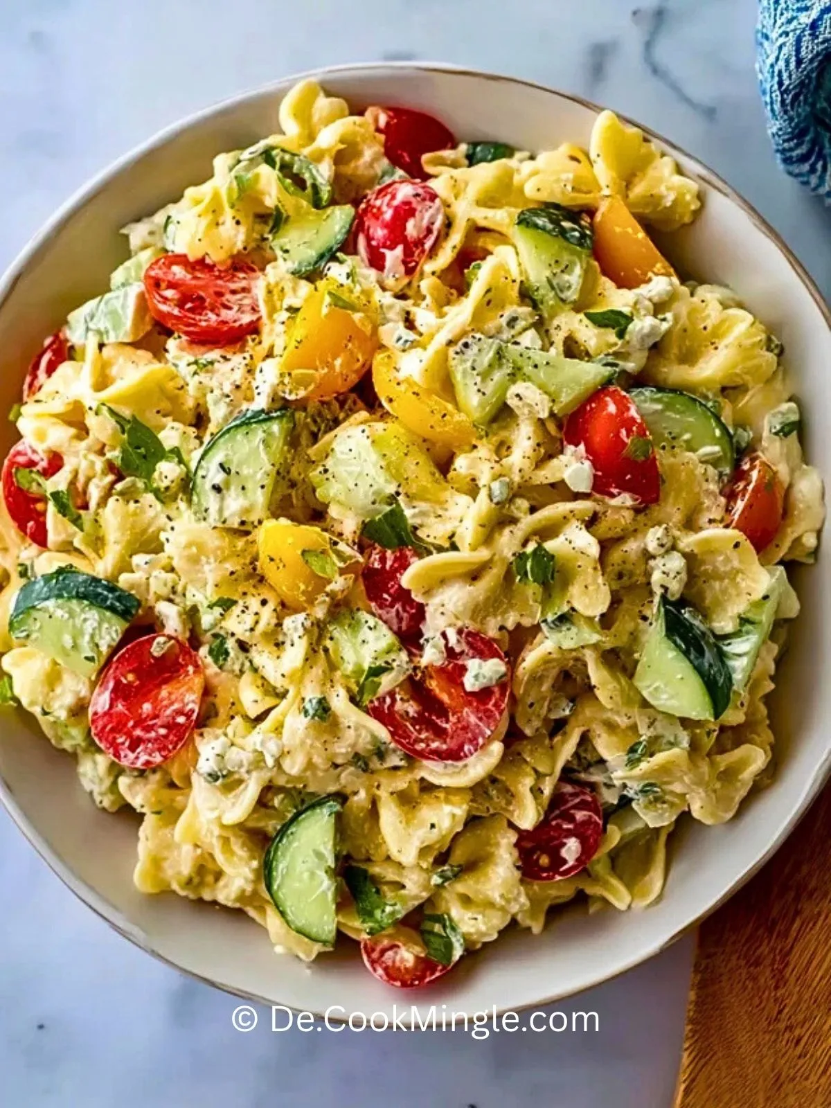 Pasta (z.B. Fusilli oder Spiralen) – Die Nudeln sind die Basis des Salats und nehmen das cremige Hüttenkäse-Dressing perfekt auf. Spiralnudeln oder andere kurze Formen halten das Dressing und die Gemüsestücke besonders gut.