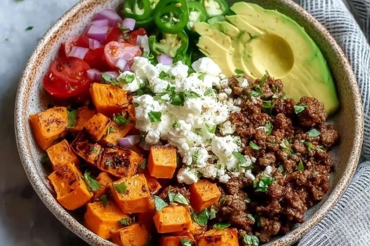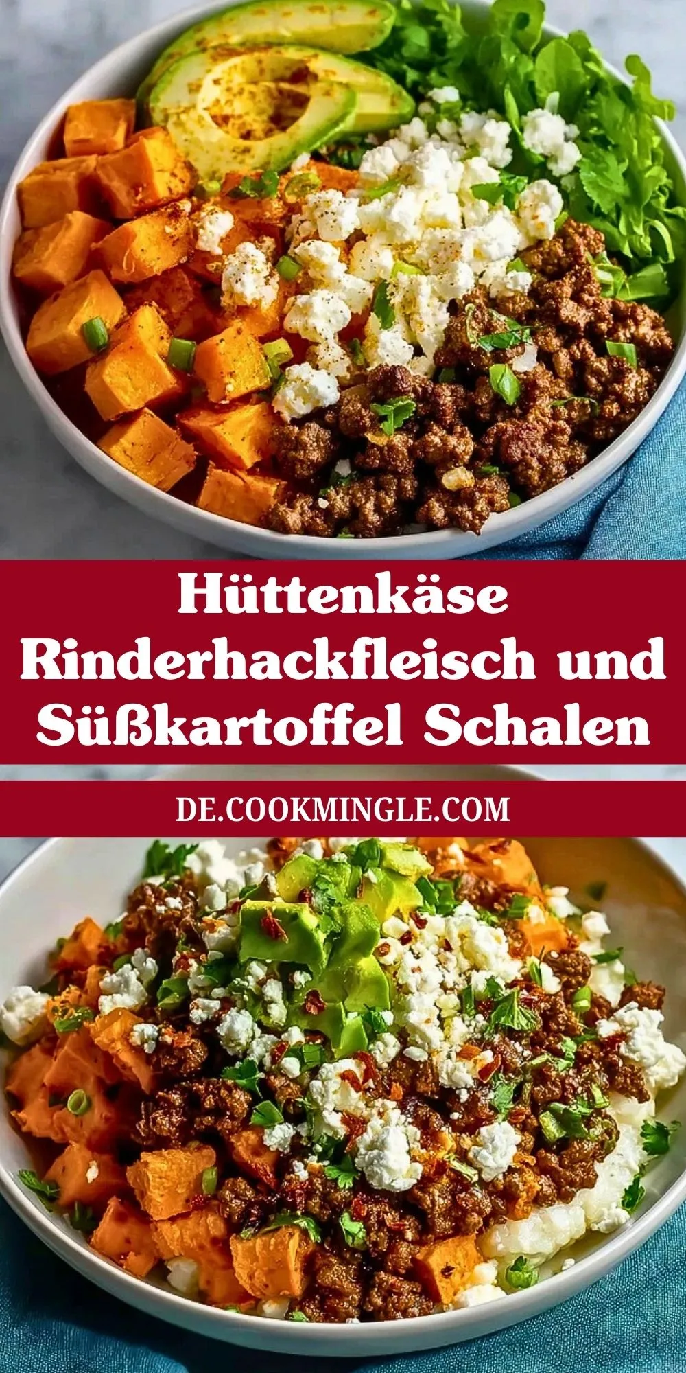 Diese Hüttenkäse-Rinderhackfleisch-und-Süßkartoffel-Schalen sind eine herzhafte, proteinreiche Bowl mit gerösteten Süßkartoffelwürfeln, würzigem Rinderhack, cremigem Hüttenkäse, frischer Avocado und knackigem Gemüse – perfekt für ein ausgewogenes Mittag- oder Abendessen und ideal zum Meal Prep.