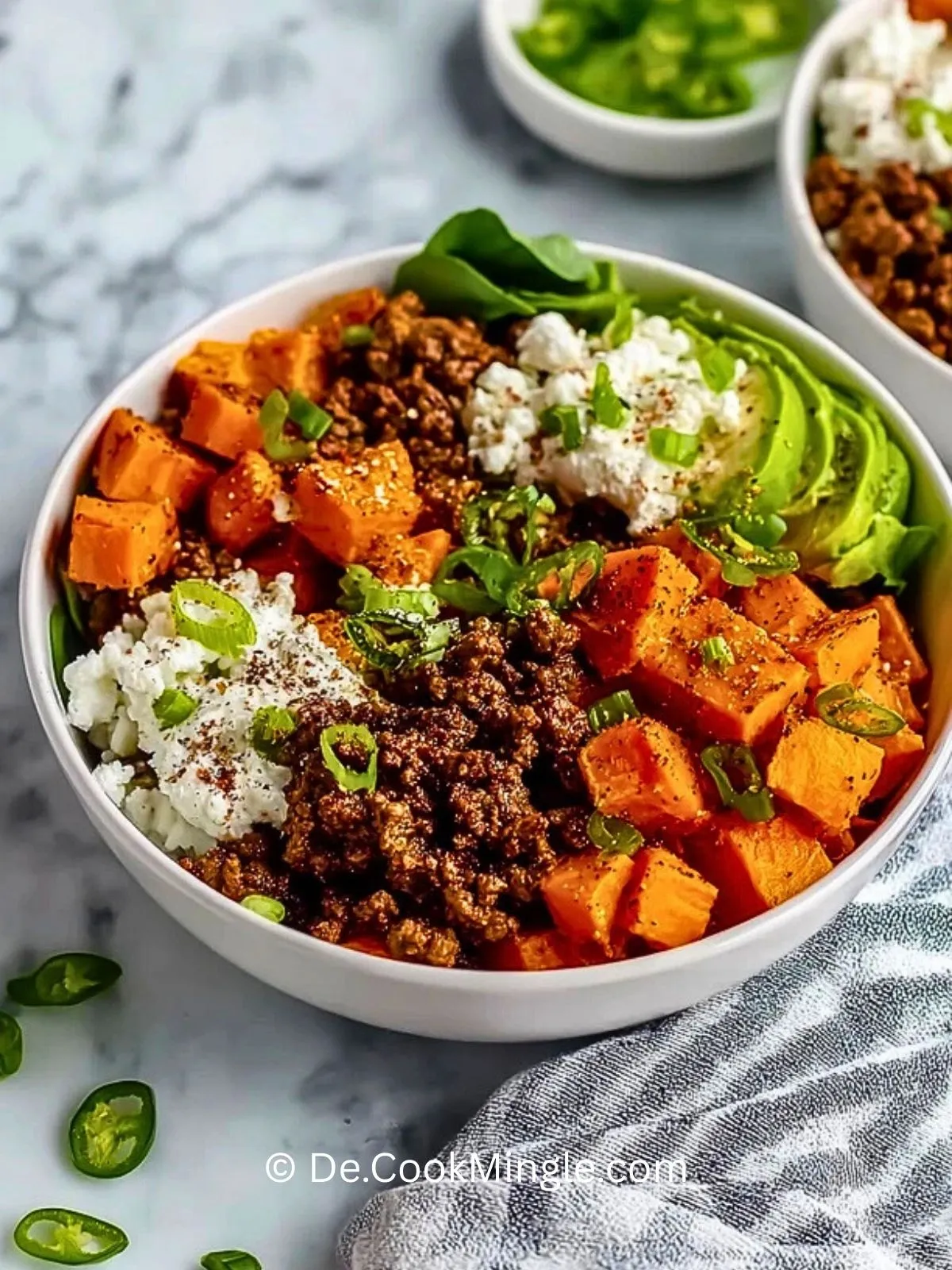 Diese Schalen vereinen gleich mehrere Vorteile: Sie sind schnell gemacht, farbenfroh, voller Nährstoffe und lassen sich wunderbar vorbereiten. Die Süßkartoffeln bringen natürliche Süße und Röstaromen, das Rinderhack sorgt für herzhafte Würze und der Hüttenkäse macht alles cremig und proteinreich. Avocado, Tomaten, rote Zwiebel und Jalapeño sorgen für Frische, Textur und ein wenig Crunch – wie ein kleiner Salat direkt in deiner Bowl.