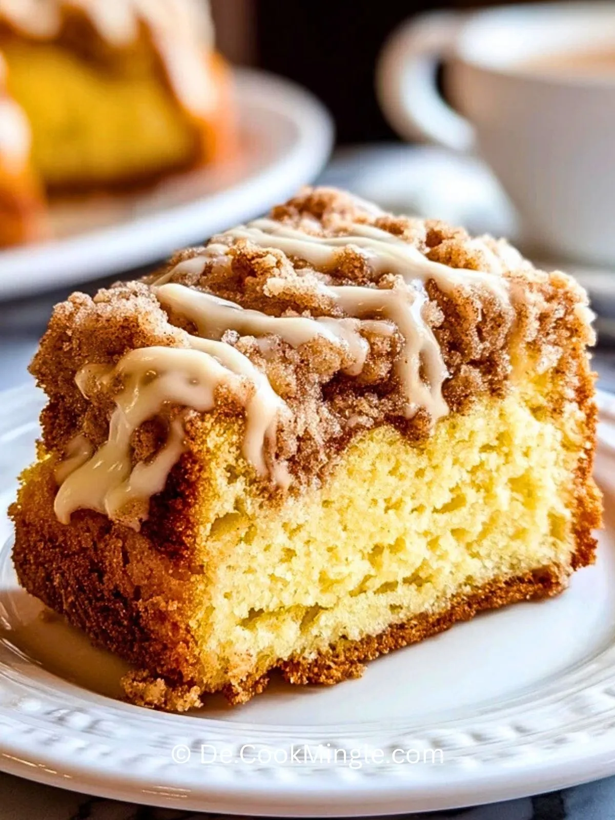 Löse den Kaffeekuchen vorsichtig aus der Form und setze ihn auf ein Kuchengitter oder eine Platte. Träufle den Zuckerguss in feinen Streifen über die Streuseloberfläche und lasse ihn kurz fest werden. Jetzt ist der Kaffeekuchen aus Fertigteigmischung bereit zum Anschneiden und Genießen.
