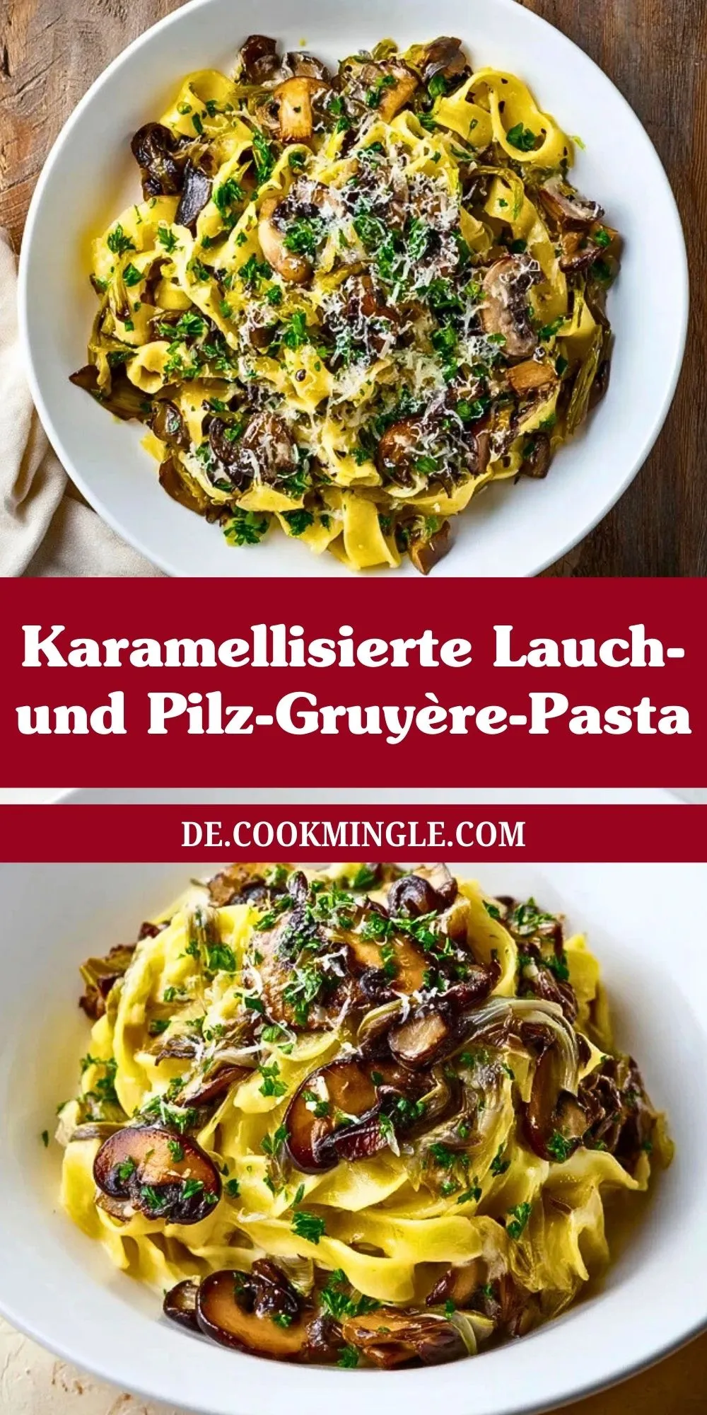 Cremige Pasta mit karamellisiertem Lauch, gebratenen Champignons und würzigem Gruyère-Käse. Perfekt für ein gemütliches Abendessen, vegetarisch, einfach zuzubereiten und voller Geschmack.