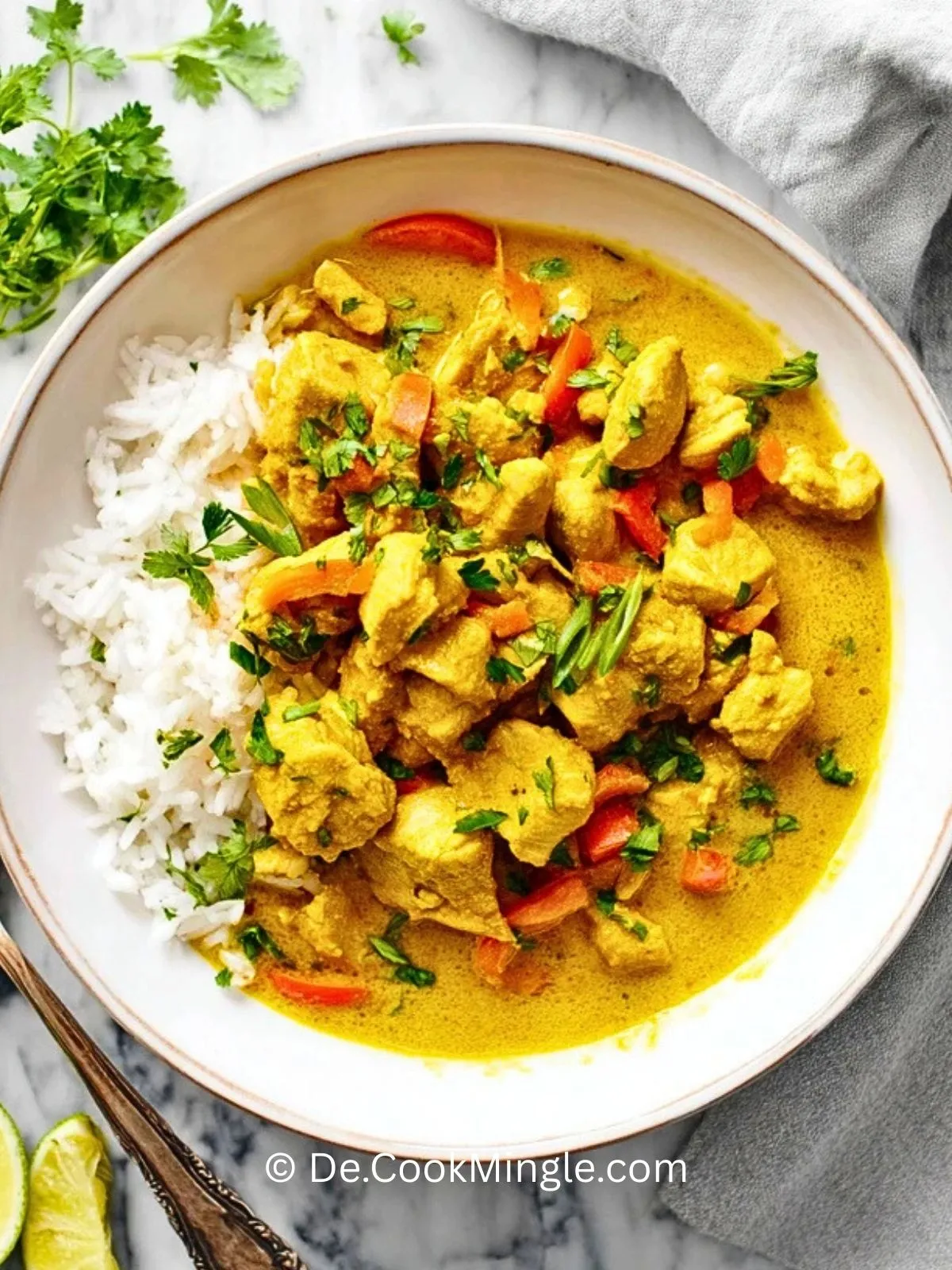 Ein cremiges Kokosnuss-Curry-Hühnchen mit zartem Fleisch, frischer Limette, würzigem Ingwer und einer mild-würzigen Kokossoße. Perfekt für Liebhaber asiatischer Küche – schnell gemacht, vielseitig und unglaublich aromatisch!
