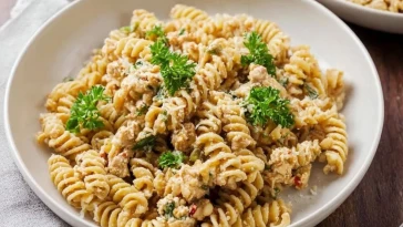 Knoblauchbutter-Hühnchenbissen mit würziger Cajun-Alfredo-Drehröhrenpasta