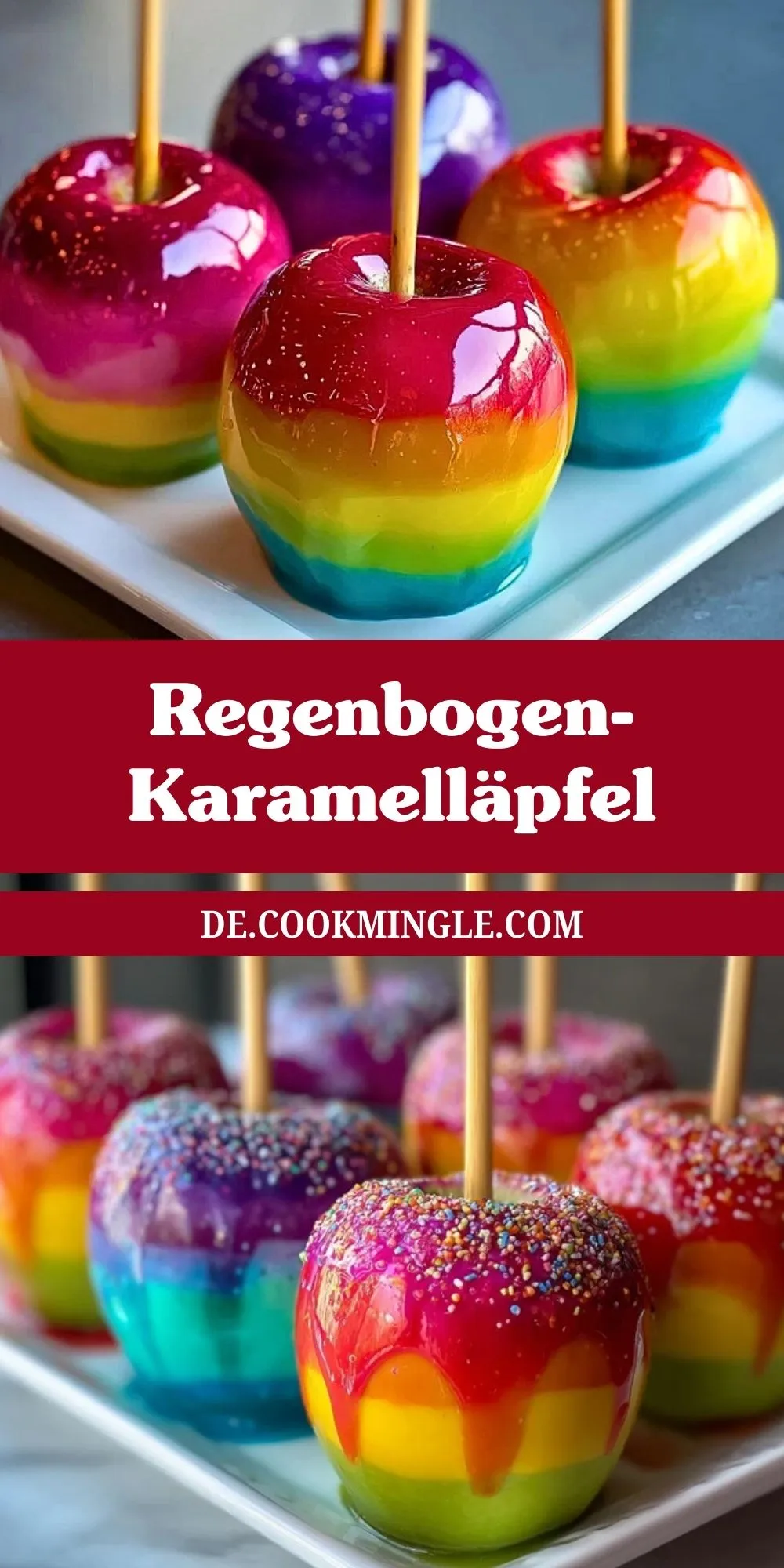 Diese Regenbogen-Karamelläpfel kombinieren knackige Äpfel mit einer glänzenden, bunt geschichteten Zuckerglasur – perfekt für Kindergeburtstage, Jahrmarkt-Feeling zu Hause oder jede Party, die nach einem fröhlichen Hingucker verlangt.