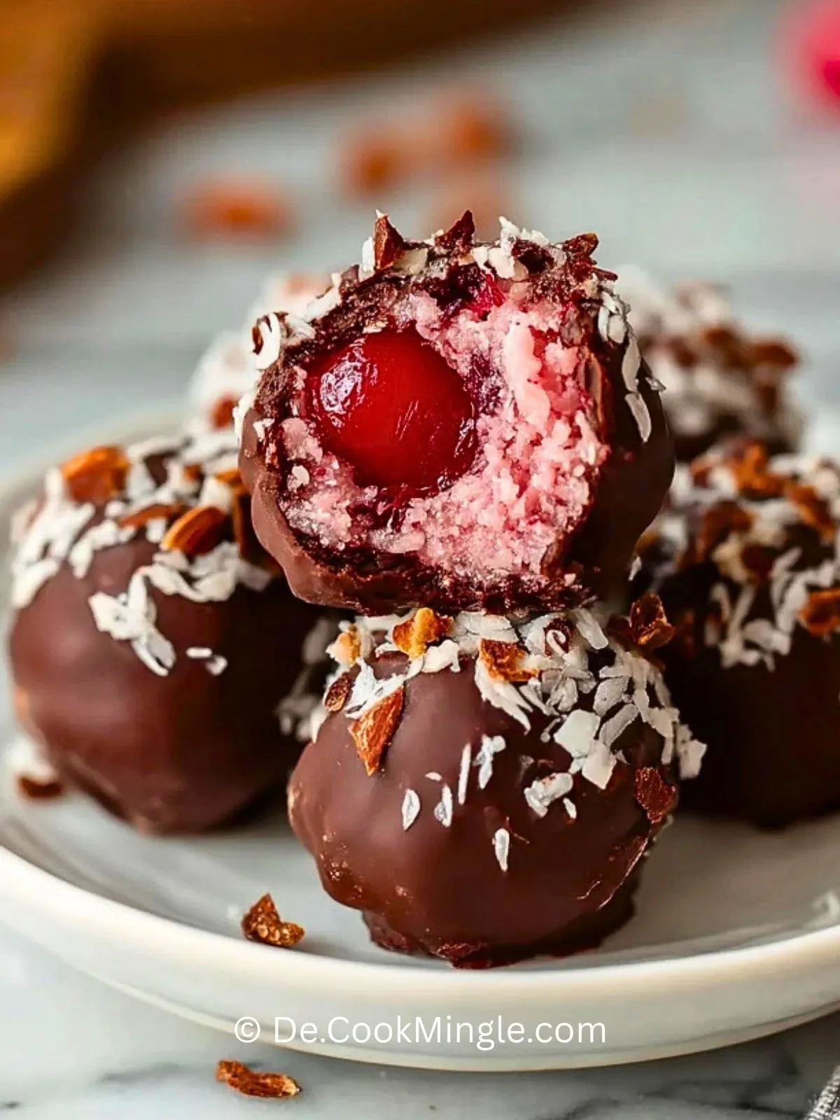 Diese Schokoladen-Marzipan-Kirsch-Kokospralinen sind kleine handgemachte Pralinen mit einer saftigen Kirschfüllung, umhüllt von Marzipan-Kokos-Masse und knackiger Zartbitterschokolade. Perfekt zum Verschenken oder für den besonderen Genussmoment.