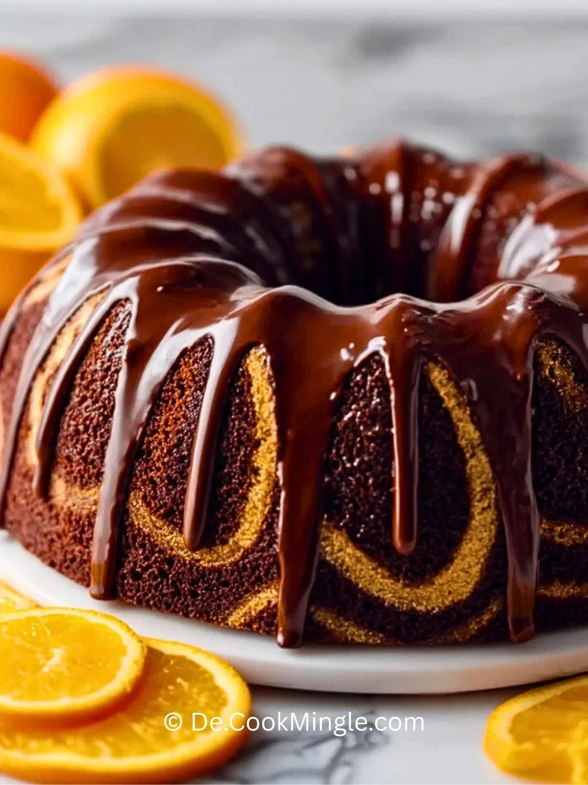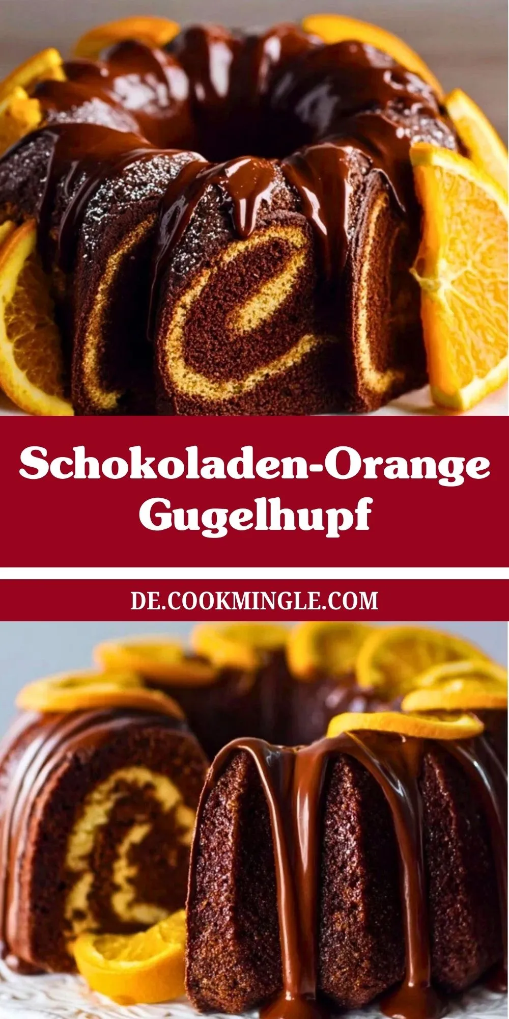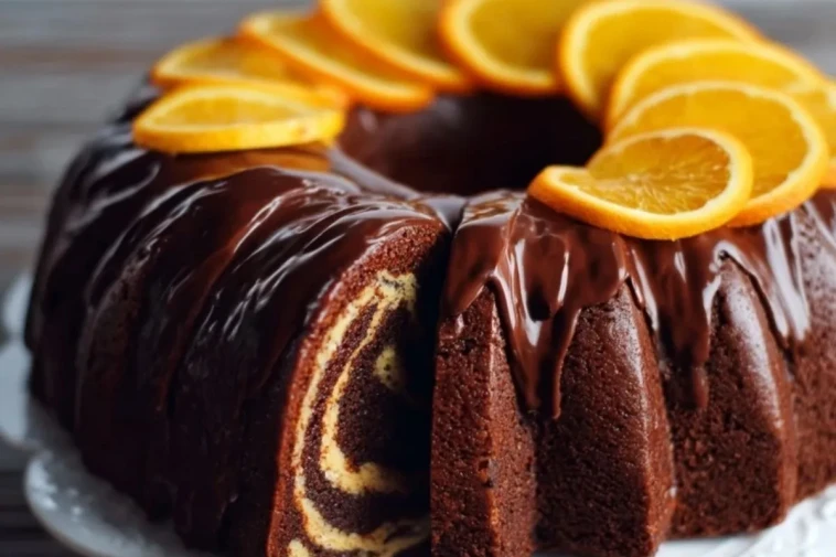 Dieser Schokoladen-Orange Gugelhupf ist ein saftiger Marmorkuchen mit feiner Orangennote, überzogen mit glänzender Schokoladenglasur und frischen Orangenscheiben – perfekt für jede Kaffeetafel.