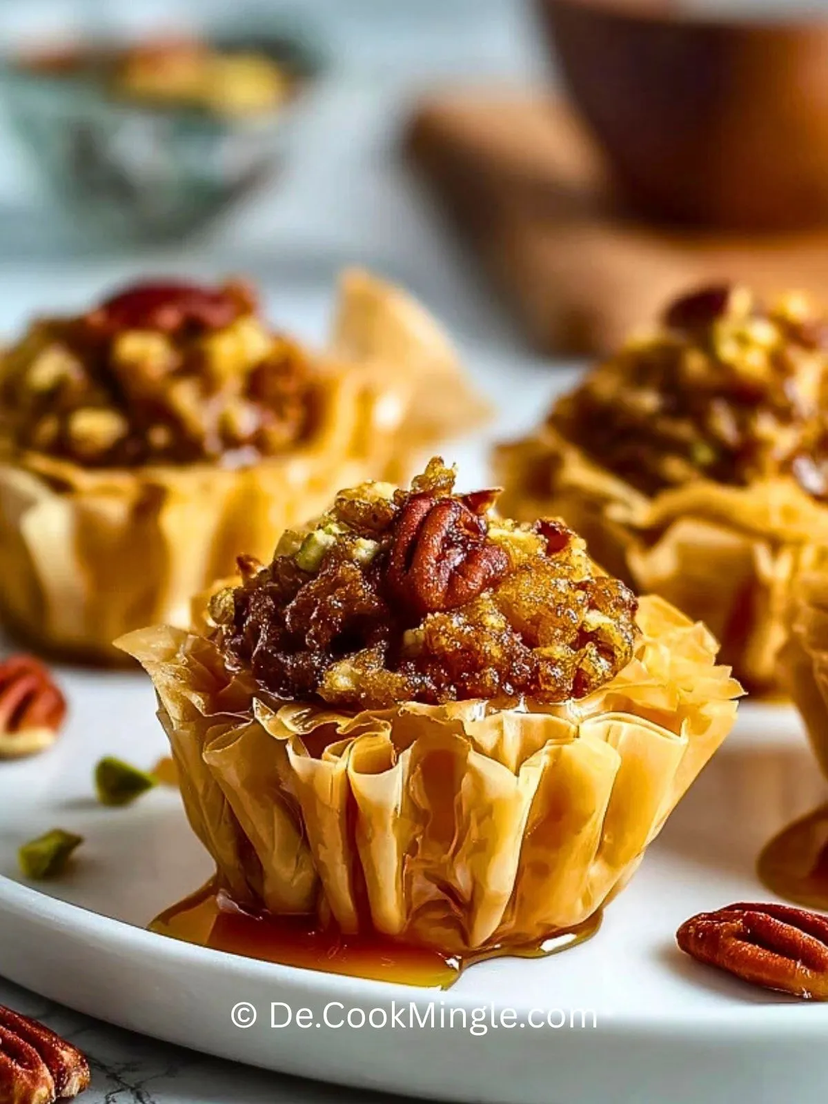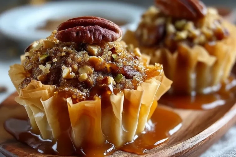 Knusprige Filo-Tassen mit einer süßen Pekannussfüllung, verfeinert mit Honig, braunem Zucker und Karamellsauce – ein elegantes Dessert mit goldenen Schichten und intensivem Nussaroma, das sich perfekt für Feiertage, Kaffeetafeln und besondere Anlässe eignet.
