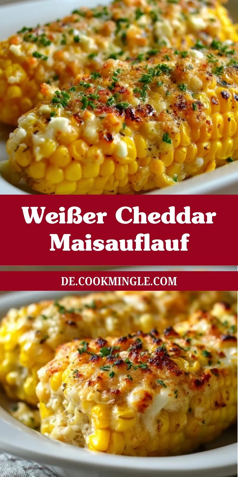 Cremig, würzig, einfach gemacht: Dieser Weißer Cheddar Maisauflauf kombiniert knackigen Mais mit einer herrlich sahnigen Käsesauce, gekrönt von goldbraunem Cheddar und frischen Kräutern. Perfekt als Beilage oder vegetarisches Hauptgericht – ein echter Genuss für jeden Anlass.