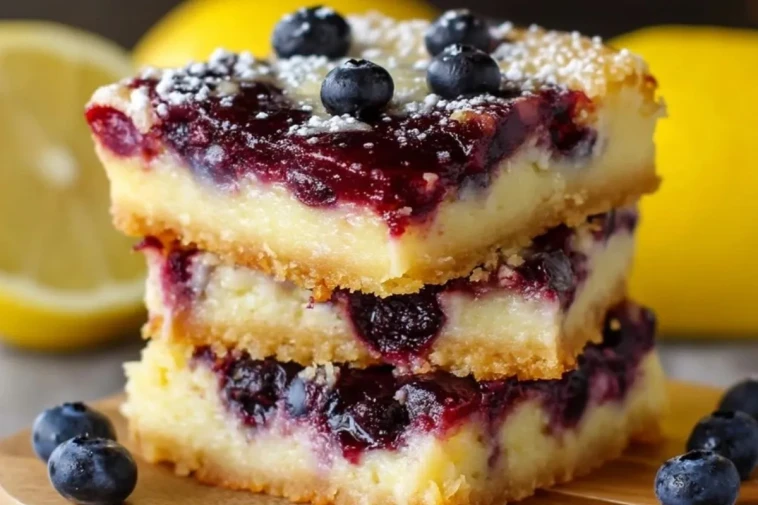 Diese Zitronen-Blaubeer-Bars kombinieren einen buttrigen Mürbeteigboden, eine cremige Zitronen-Frischkäse-Schicht und ein fruchtiges Blaubeer-Topping zu einem erfrischenden Dessert, das sich perfekt vorbereiten, gut transportieren und sauber in handliche Stücke schneiden lässt.