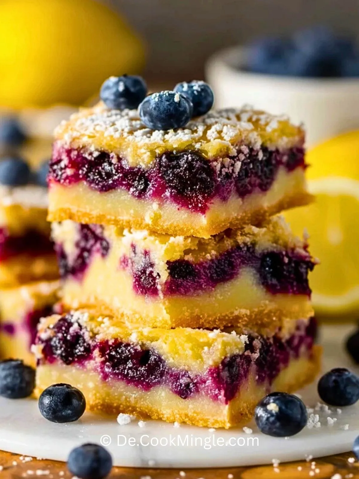 Beim Abkühlen zieht die Füllung an und wird schnittfest. Schneidest du die Bars zu früh, kann die Mitte noch zu weich oder cremig sein und die Stücke laufen auseinander. Die Kühlzeit sorgt außerdem dafür, dass sich Aromen von Zitrone und Blaubeere voll entfalten.
